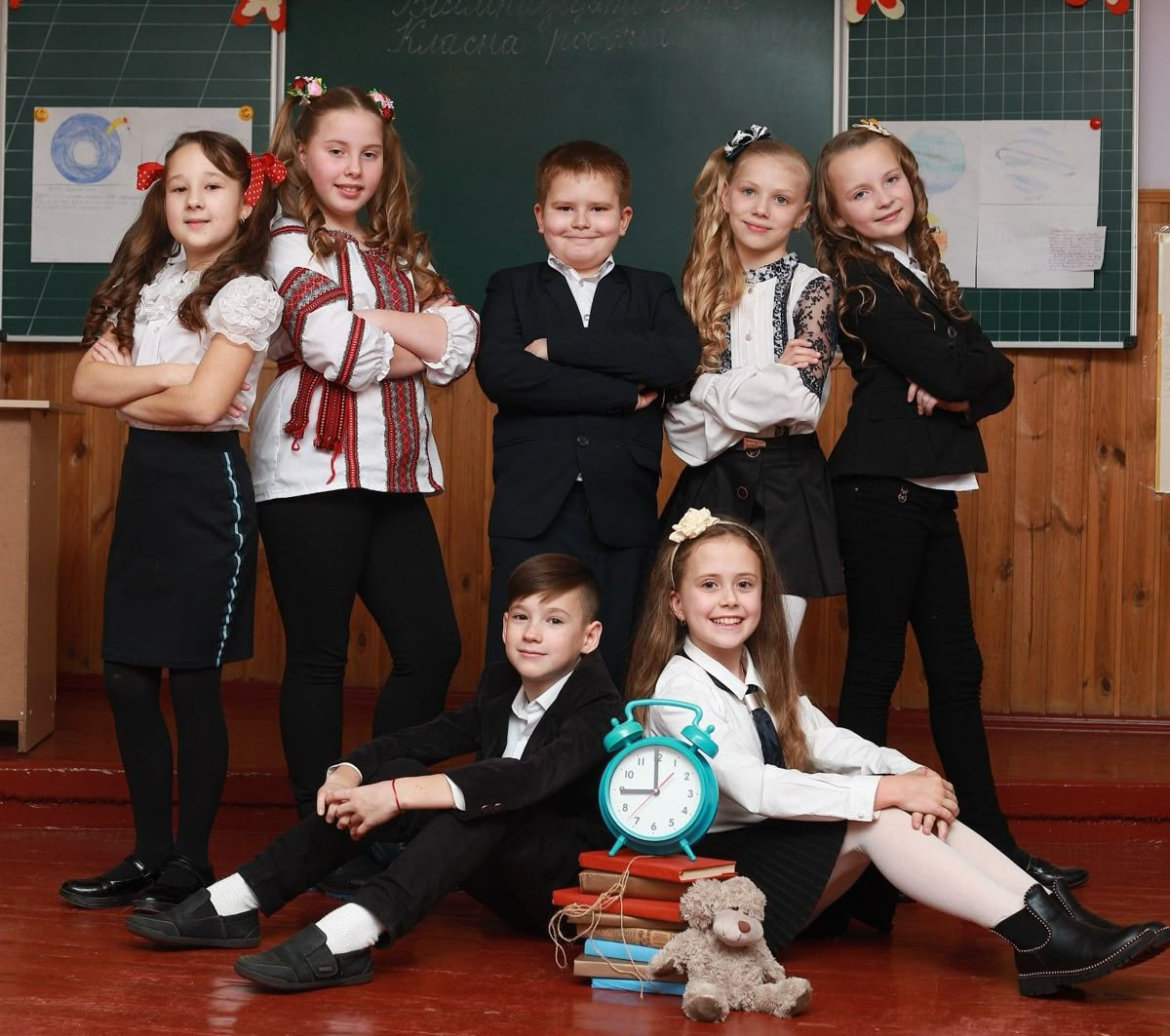 — Фотосессия с друзьями в классе или в фотостудии группами по 4-7 человек и по 2-3 человека с самыми близкими + общая фотография в классе с учительницей
